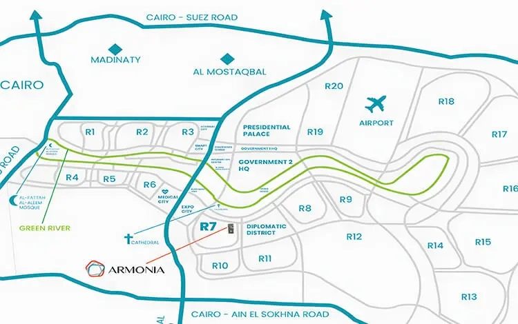يحيط بالكمبوند شبكة من الطرق والمعالم الحيوية التي تضمن لك إقامة متكاملة ومترابطة مع أهم النقاط في العاصمة، وهذا الموقع لا يوفر الراحة المعيشية فحسب، بل يمنح المشروع قيمة استثمارية متزايدة ومضمونة بفضل تمركزه في واحدة من أرقى مناطق العاصمة، ومن أبرز المعالم الذي يقترب منها كمبوند أرمونيا العاصمة الإدارية: