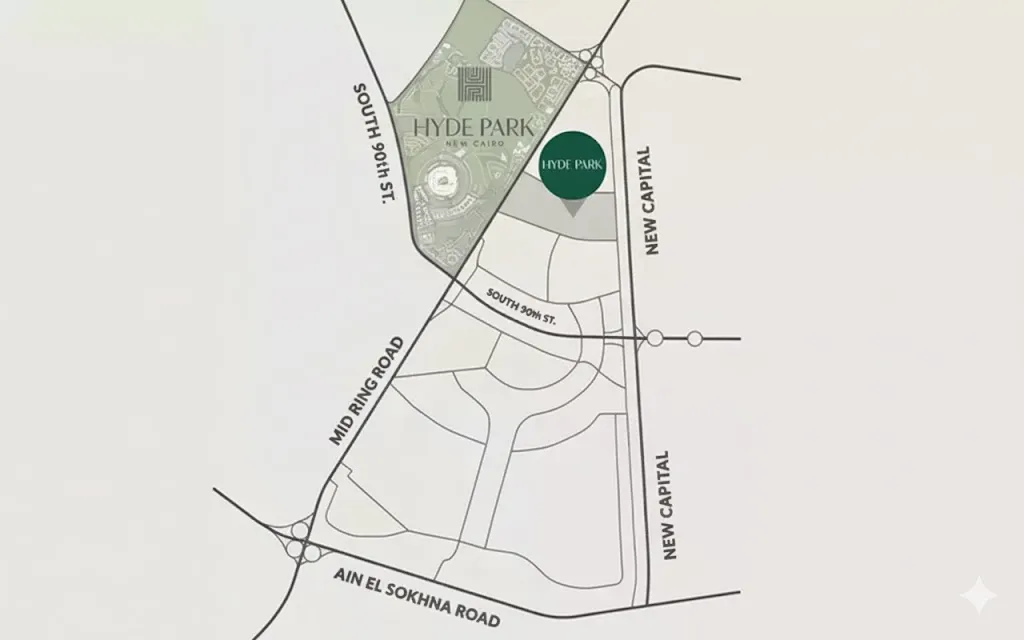 يحيط بكمبوند هايد بارك سنترال التجمع السادس شبكة من الطرق الرئيسية والمرافق الحيوية التي تضمن سهولة التنقل وتوافر الخدمات ومنها: